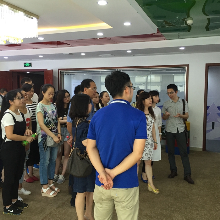 为推进产学研结合,提高研究生培养质量,6月14日下午,在经济与贸易学院常务副院长彭炳忠教授、副院长罗双临教授以及副院长陆杉教授的带领下,部分老师和全体经贸学院研究生前往湖南艾瓦特网络科技有限公司参观学习。