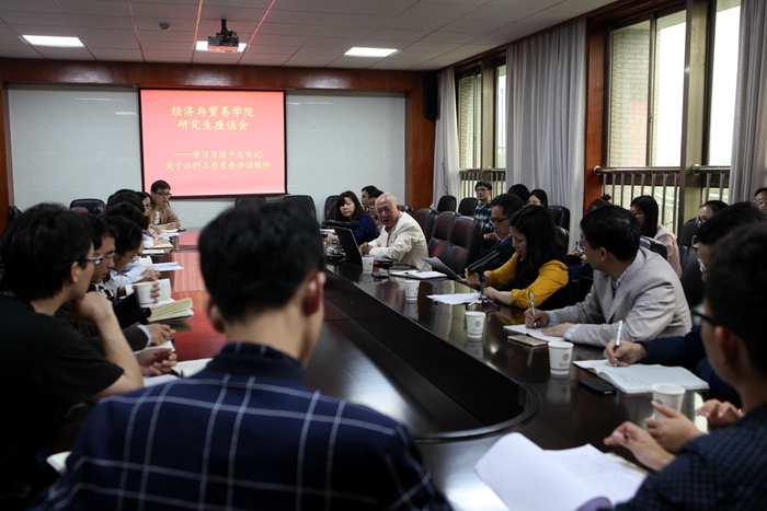 研究生院尹碧波副院长认为,研究生要结合当下的经济发展形势,结合中央的重要精神找准研究方向,多读马克思主义经典著作;经贸学院刘乐山副院长表示同学们要及时学习党中央的重要精神,要多读书,并忧思国内马克思主义经济学的现状,鼓励同学们为建立一个国内完整的经济学体系而奋斗;经贸学院罗双临副院长则提出,我们的研究生要注重创新,研究生的培养要注重质量,研究生们要坚持举办学术沙龙;研究生导师代表尹向飞博士从“找问题、找知识、找方法、精心做”四方面向与会的研究生们分享了做科研的心得;