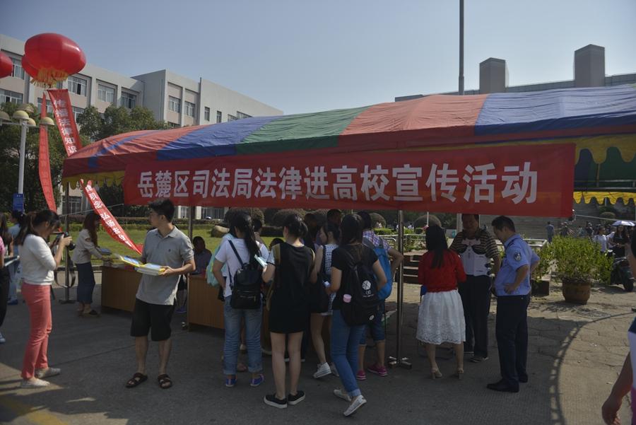 此次法律进校园宣传活动是由岳麓区司法局下属望城坡街道司法所和老虎岭社区共同举办,我校青协与保卫处协办。望城坡街道司法所所长陈永、老虎岭社区主任石清泉、保卫处副处长刘铁牛等都在现场向同学们普法,司法局法律援助中心的专业律师也在现场为同学们答疑解惑。