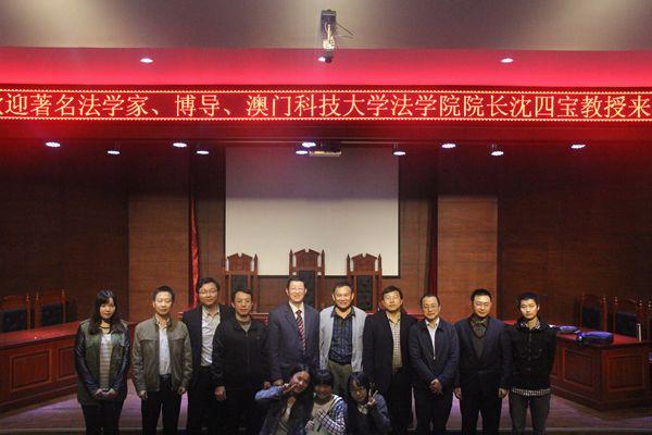 11月7日晚,著名国际经济法学家、国家级教学名师、博导、澳门科技大学法学院院长沈四宝教授应邀来我校讲学。此次讲座在三教学楼F101大学生模拟法庭举行,法学院院长杨峥嵘教授、党总支副书记刘期湘教授以及法学院百余名师生代表参加此次讲座。