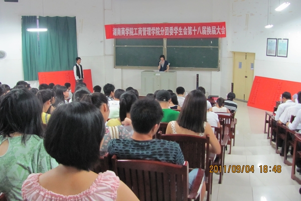 9月4日晚,工商管理学院分团委学生会第十八届换届大会在F201隆重举行。学院党总支书记匡玉梅,副书记肖劲松以及全院近200名师生代表参加了会议。