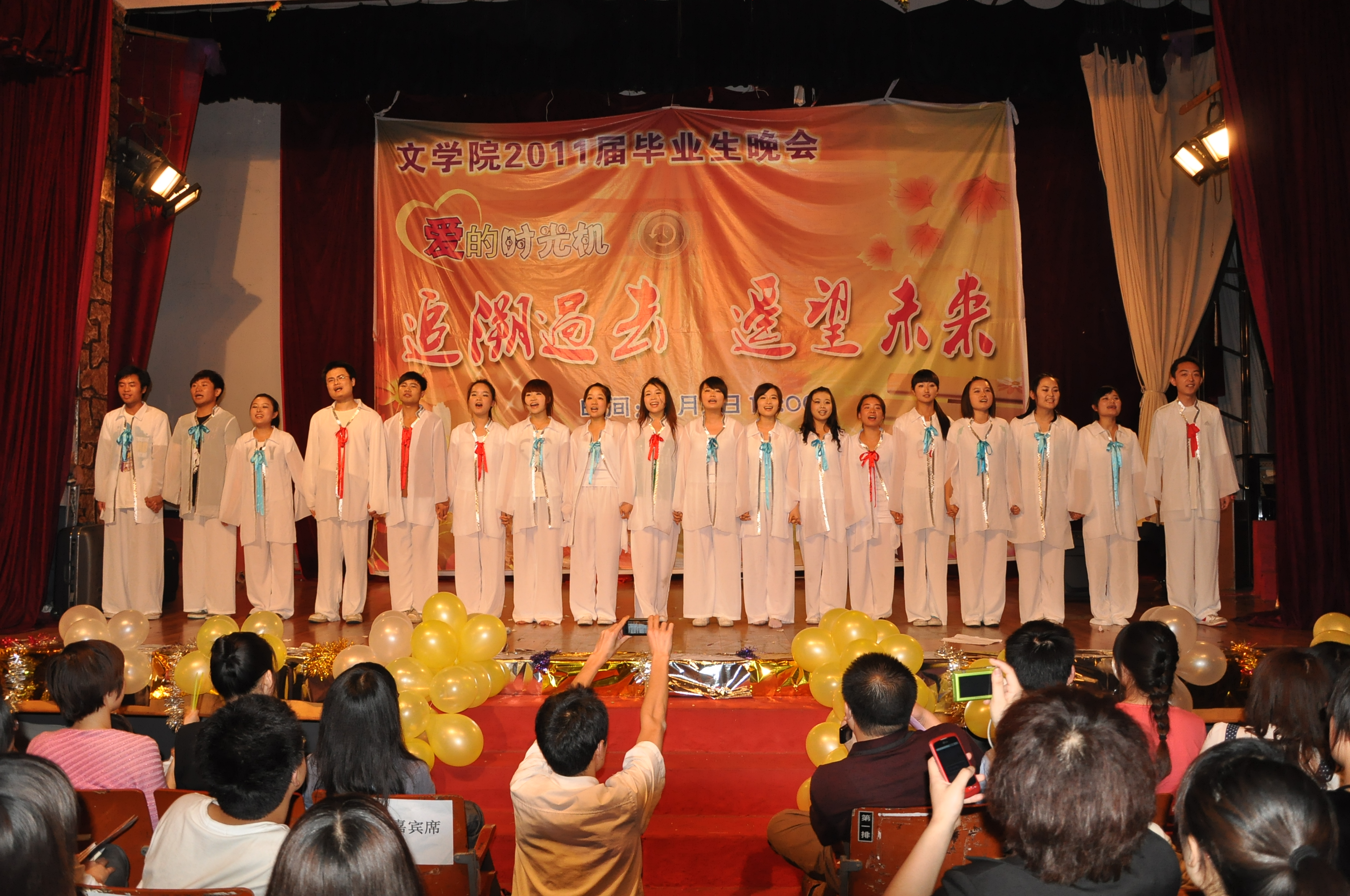 6月2日晚,文学院2011届&“爱的时光机,追溯过去,遥望未来&”主题毕业生晚会在我校大礼堂举行。