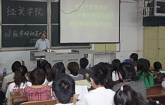 5月15日晚,经济与贸易学院在A309召开2011年考研经验交流会暨08级考研动员大会。会议由经贸院学生工作办公室主办,经贸学院院长刘天祥教授、党总支书记彭炳忠教授出席并发言。
