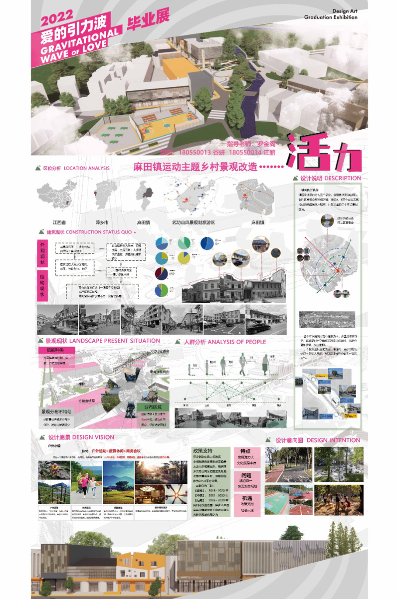 位于武功山脚下的麻田镇有着丰富的资源禀赋,绿水青山是麻田镇乡村的宝贵财富。我们将运动元素融入到本次对于镇区内建筑及景观的改造上,从地域文化、符号语言及色彩表达三个维度出发,一改小镇里沉闷的环境,使气氛更加活泼。充满设计感的不规则建筑及景观设计,让人们觉得充满活力,缓解压力。
