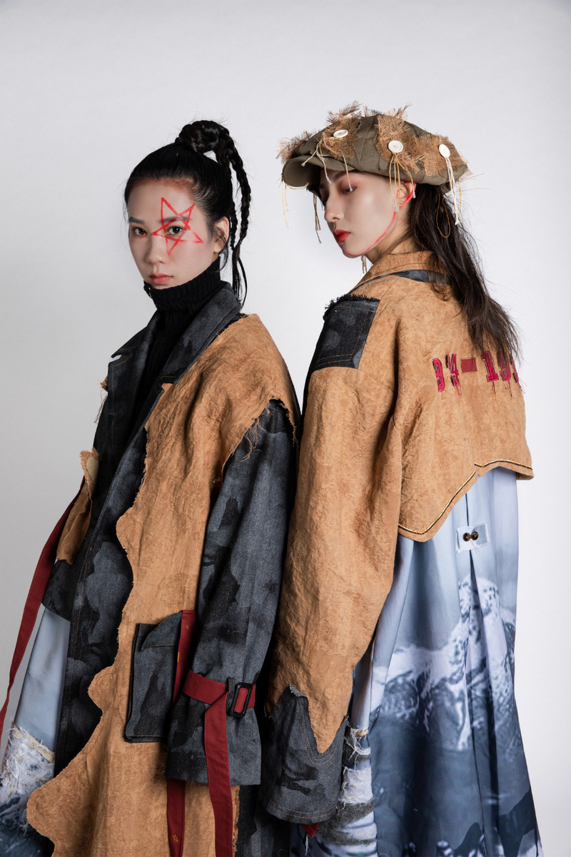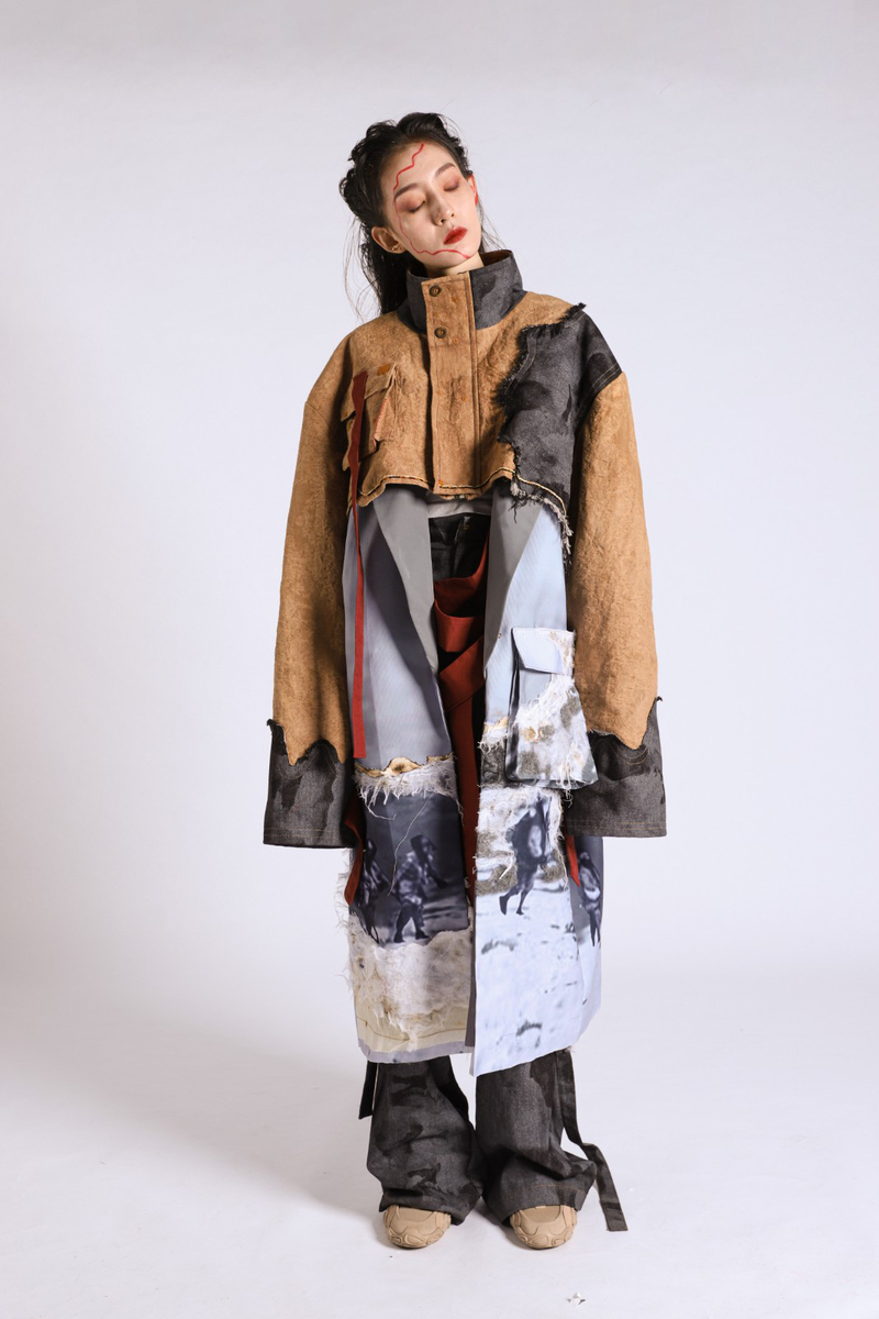 作品简介:此系列灵感来自于二万五千里长征,重点表现长征中所产生的革命精神。款式借鉴了红军军服的基本形制,裤装采用了镂空与拼接工艺,营造破碎感,表现长征艰苦情况;色彩采用了黑、白与驼色作为主色调,表现先烈在长征时期翻越的雪地与山川;工艺上运用毛线以及绗缝制作出以长征路线图为主线的面料再造。整体凸显出后人对于长征的纪念以及对长征精神的继承。