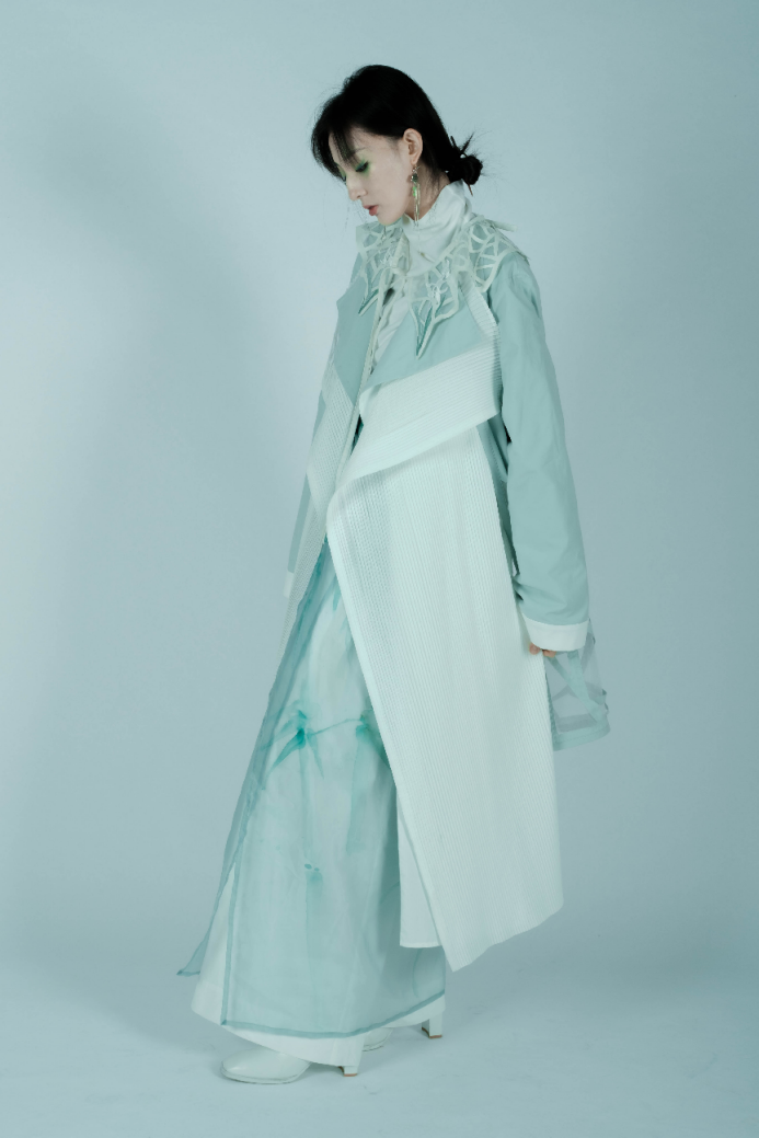 作品简介:本系列灵感来源于苏州园林中的建筑元素漏窗和铺地,漏窗在具有通光作用的同时又富有装饰性,铺地造型独特增添园林的趣味的同时又有着美好寓意。本次设计将以漏窗与铺地的建筑元素融入到服装设计中。