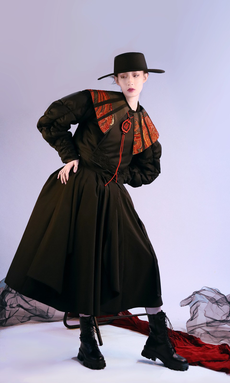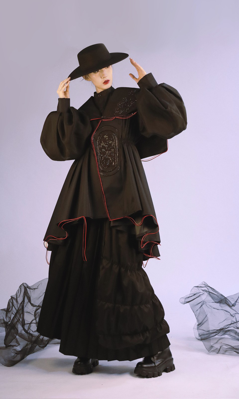 作品灵感:此系列灵感来源于汉代漆器,将其艺术特征与服装设计相结合,纹样上选用漆器中最典型的云气纹,廓形设计借鉴了漆器外轮廓的大廓型元素,服装面料主要采用弱光感的黑色面料,红色面料为点缀,整体设计端庄大方又不失时尚感,在视觉上重新定义了汉漆的应用范围,体现了器物与服装的完美结合。