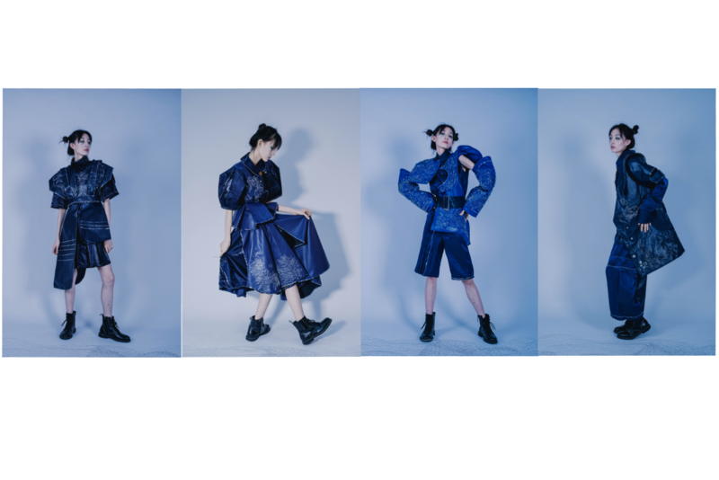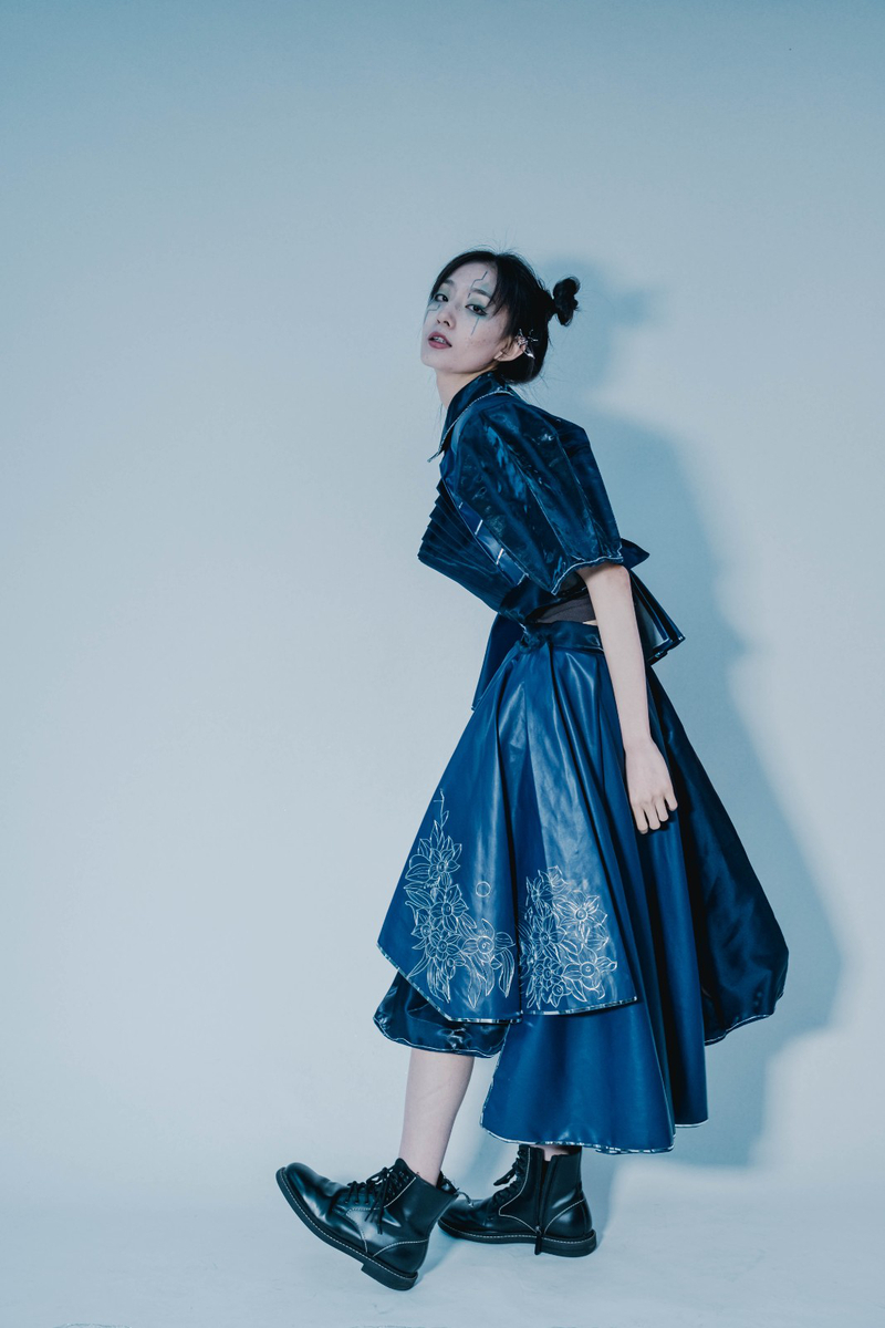 作品简介:本系列灵感来自于非遗传统工艺掐丝元素。在廓形设计上多使用圆形和层层叠叠的设计,与掐丝弯弯绕绕的外形相符合,在图案设计上使用传统的缠枝莲花纹和鱼纹,将其以掐丝的形式运用在服装上。