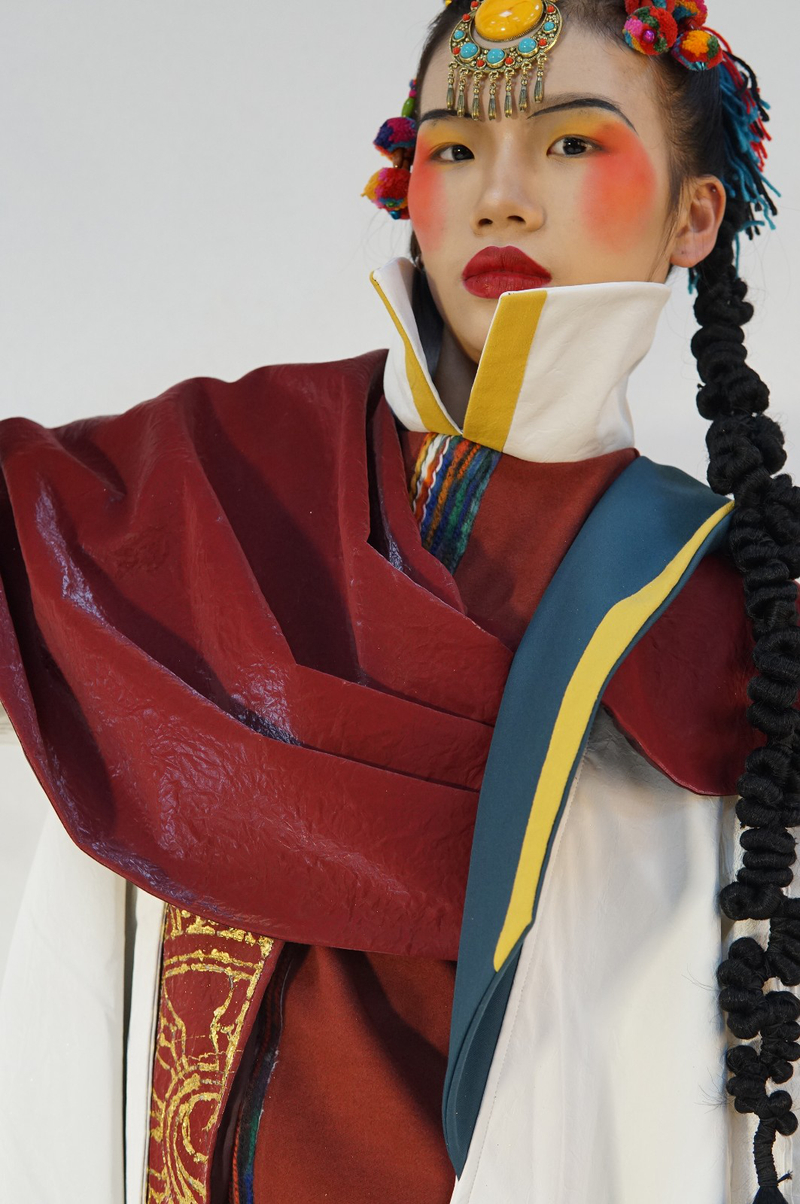 设计说明:此系列从藏族传统纹样上获得了灵感的源泉,采用了藏族传统纹样元素中的吉祥纹样。按照现代人们的审美意趣,简化纹样形式,让纹样具有简洁和直观的效果,并运用在服装的马甲、袖子等部位。工艺方面主要采用了编织与激光切割,面料选择了皮料、数码印花等一系列创新面料应用于整体设计。