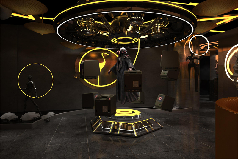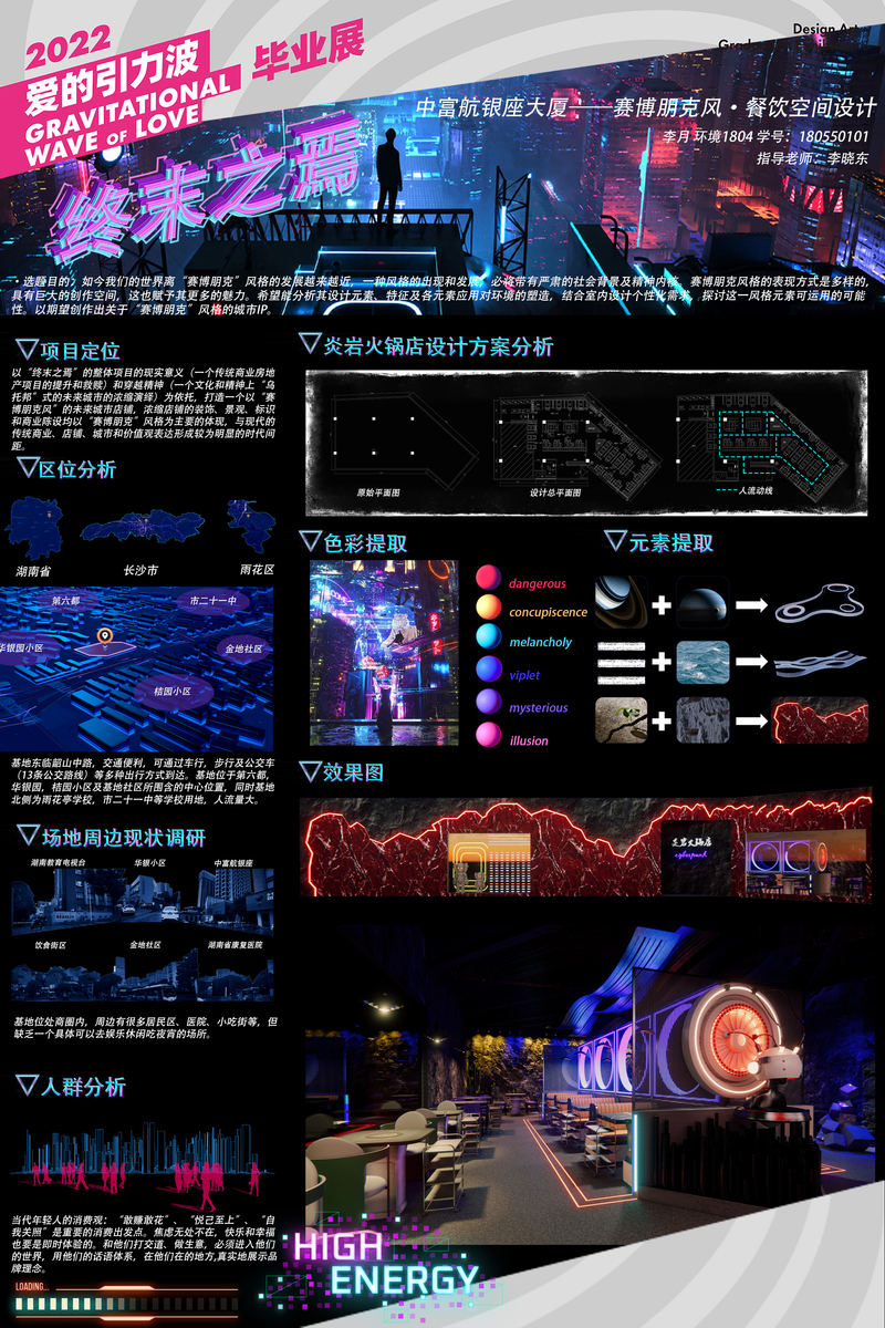 作者:黄熠作品简介:我的设计主题是将传统复古的东方元素解构,传统的道教元素与未来的机械元素结合,在拼贴与碰撞中,打造一个具有鲜明个性的空间。结合了国潮和赛博朋克戏剧空间,碰撞出新式国潮风。中式墙檐下是赛博朋克十足的装饰。赛博朋克作为一种后现代主义作品,它具有着强烈的多元性和零散性风格。因此与禅宗美学融合,选用东方视听符号来塑造未来空间场景。