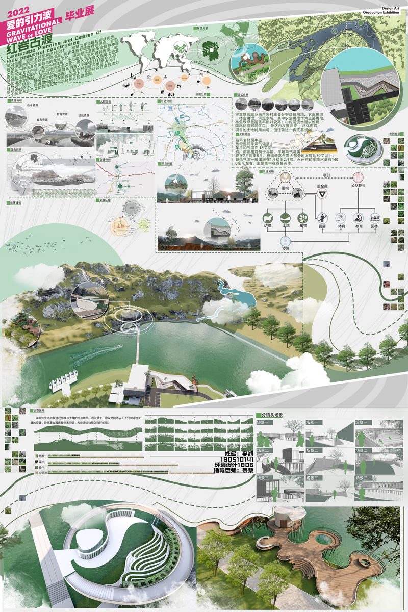 作者:李润作品简介:本项目为葫芦岩美丽乡村景观规划设计,地处县南部,东与蚣坝镇隔河相望,南与江华瑶族自治县桥头铺镇、界牌瑶族乡接壤,西与祥霖铺镇交界,北与蚣坝镇毗邻,辖区总面积107.11平方公里,改造范围为旅游区、住宅区二部分,主要包括房屋建筑、葫芦岩、渡口和游乐设施构成。整体来看,红色文化旅游资源丰富,自然资源丰富,绿化覆盖率相对较高,但环境美观度不够,娱乐项目常规化,缺少年轻活力。 综上所述:此次项目重点是:增强景区红色文化内容,充分利用自然资源红色文化资源,提升环境美观度,注入年轻元素,提升整体村落居民的舒适度,旅客的体验度。