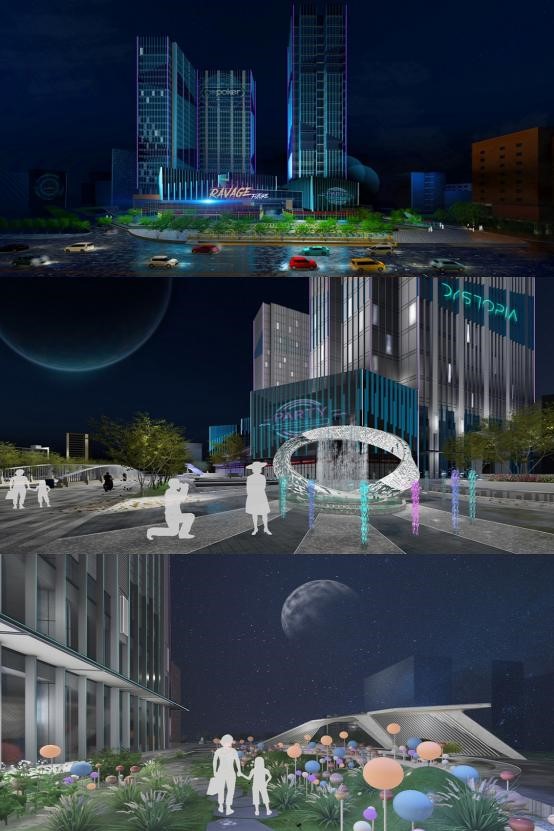 作者:王怡琴作品简介:以“双城故事”的概念去设计,新城高端科技感强烈,老城较为复古,风格定位赛博朋克。外建筑外围的广场主要体现科技感,场地分割提取酸性流体的形式,给人造成最直观的视觉享受,并将其色彩元素运用到后期设计当中。第二个区域“桔园夜市”一块位处于老城与新城交界处的地方,桔园夜市是一个集展示、售卖、路演、打卡四个功能为一体的神秘区域,白天不营业,只有当夜幕降临,赛博朋克公路派对就开始了。