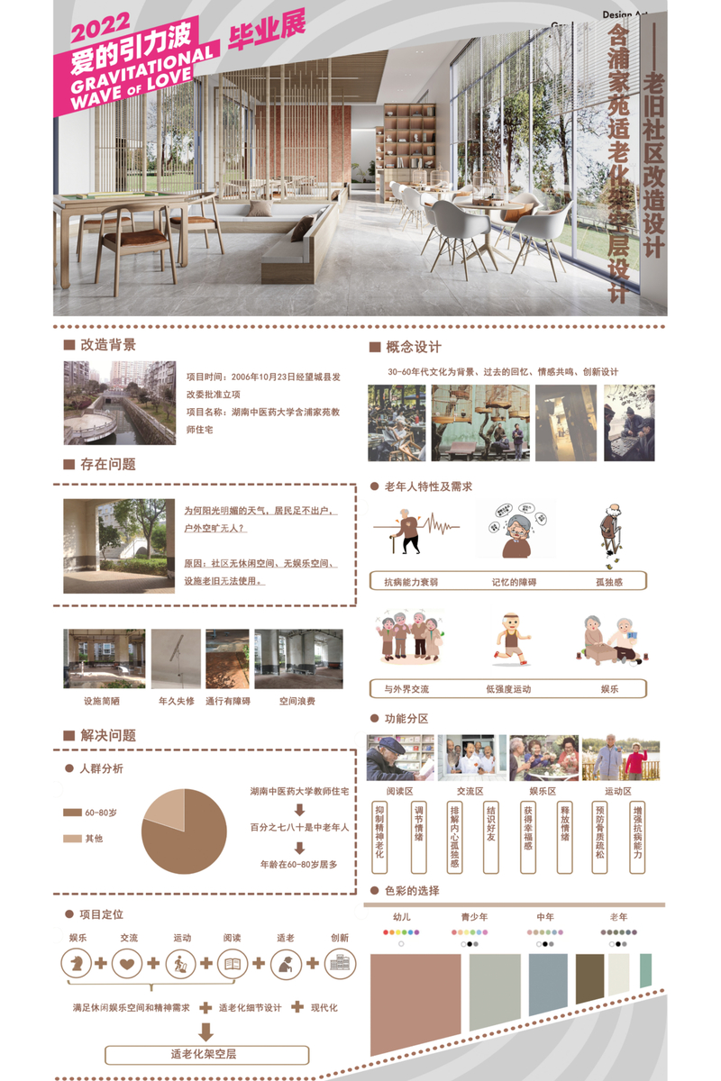 作者:高妍作品简介:含浦家苑适老化架空层设计主要以30-60年代文化为背景,引入老一辈的生活回忆,再用现代的氛围表现出来,融入经过岁月洗礼的红砖墙、传统的藤编物件、热闹的老茶馆的生活场景,以阳光温暖、自然和风、乐活健康、精致为基调。其次进行一个合理的功能划分,以老年人的需求为主,设置棋牌区、交流区、阅读室、运动区等等,完善社区的基础设施,贯彻政策所提出的建设现代化新长沙。