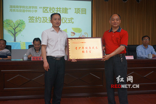 湖南商学院北津学院党总支书记陈卫东与中岭小学校长吴安华签订了“区校共建”合作协议,湖南商学院北津学院院长张贵华与中岭小学校长吴安华为“青少年健康成长辅导室”授牌。