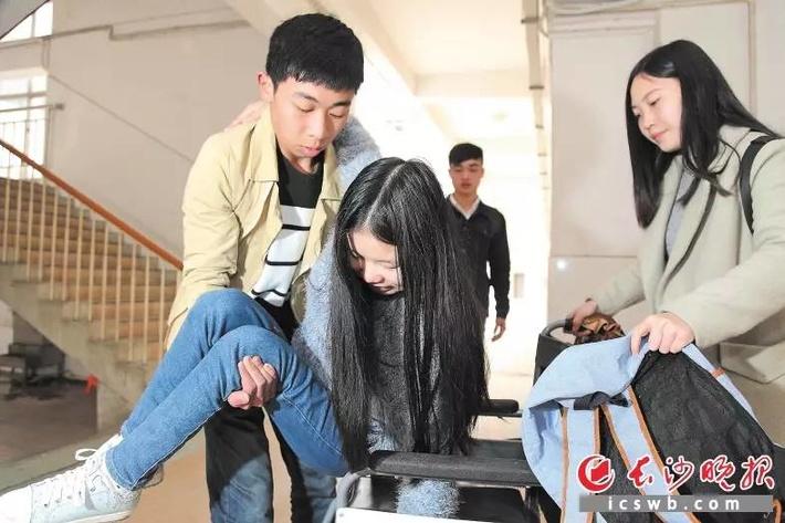 昨日11时45分,湖南商学院一栋教学楼的3楼,下课铃响后,一名男同学将陈望抱起,下楼梯到一楼后,将陈望扶到轮椅上,另两名女同学推着陈望回到寝室。对陈望和她的同学们来说,这已是寻常一幕。