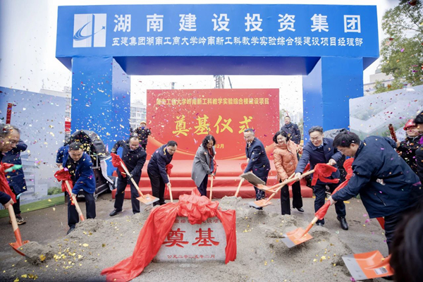 在丝丝细雨中,南校区岭南风华楼(新工科教学实验综合楼)建设项目奠基现场充盈着欢乐喜悦的气氛。经典歌曲《节日欢歌》《长江之歌》在现场热情唱响,唱出了对学校迈上建设发展新征程的欢欣鼓舞,表达了对祖国的深厚情感。 校党委书记、湘江实验室主任、中国工程院院士陈晓红,校党委副书记、校长廖湘岳等全体在校校领导、党委委员和项目建设相关单位代表共同为风华楼启动建设培土奠基。现场响起热烈的掌声。校党委委员、副校长赵华在致辞中表示,风华楼建设项目自立项批复以来,在学校党委的坚强领导和统一调度下,各部门通力协作、狠抓落实、不负重托,如期完成项目开工前期准备工作,再一次展现了“湖工商速度”,彰显了学校高质量发展的新气象、新作为。