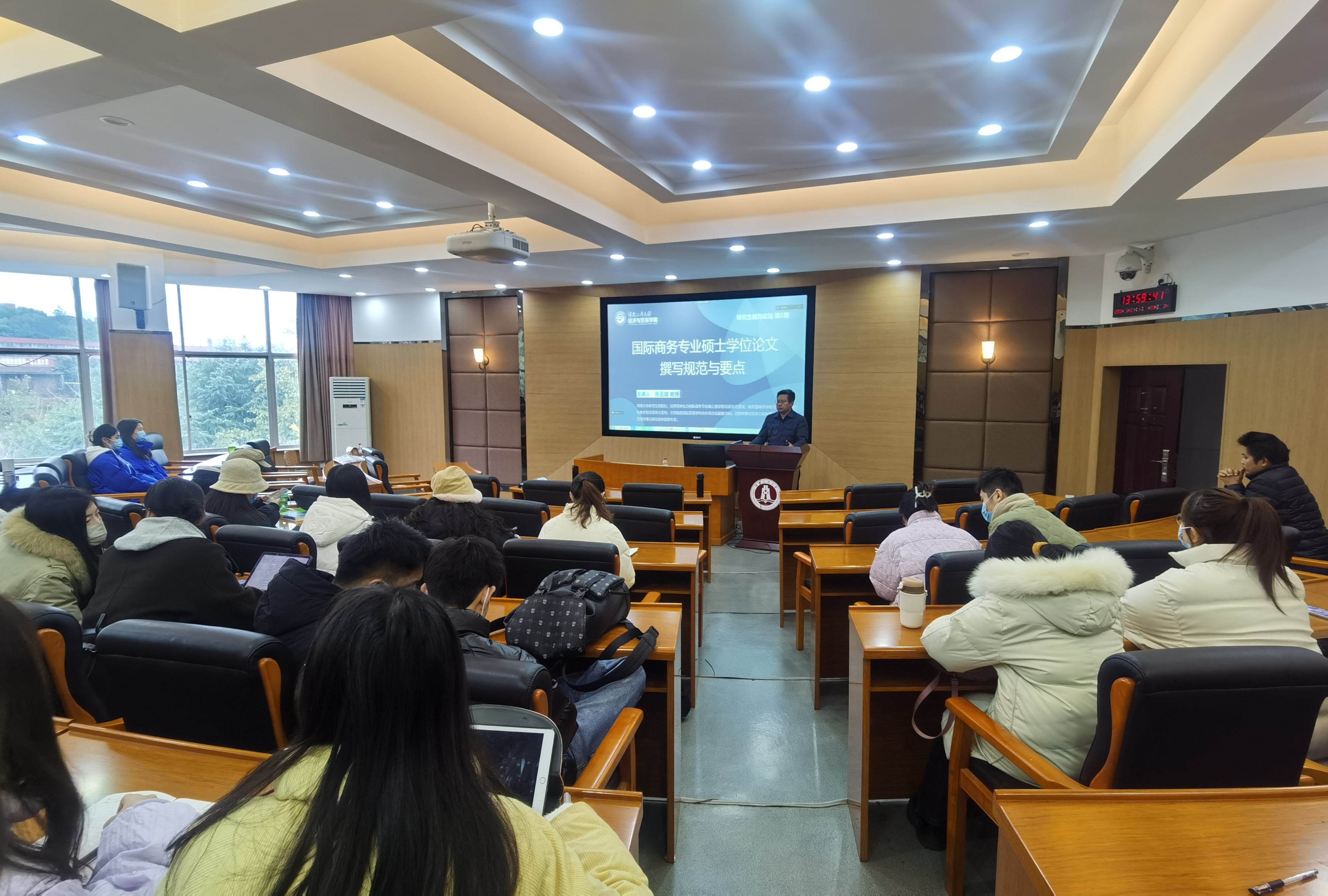 12月1日下午,经济与贸易学院在至诚楼A309举行了经贸研究生教育论坛第1期专题讲座,主题为“国际商务专业硕士学位论文撰写规范与要点”。本次讲座邀请了国务院学位办国际商务专业硕士教学指导委员会委员、湖南大学研究生院院长张亚斌教授主讲,经济与贸易学院向国成院长主持,吴伟平副院长、研究生工作办公室主任杜佳慧老师、国际商务专业全体研究生参加了此次讲座。