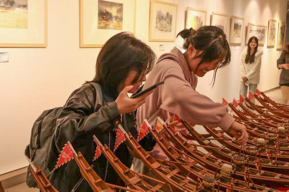 本次展览的作品题材兼具灵动与厚重:既有龙舟竞渡的热烈鲜活,尽显民俗活力;亦有濂溪故里的静谧悠远,暗藏理学禅思;更有古村山水的清新雅致,勾勒自然本真。同学们循着画作脉络缓缓前行,时而驻足凝视揣摩笔墨技法,时而轻声交流分享观展感悟,在色彩与线条的交织中,沉浸式感受艺术名家将山水之美、人文之韵凝于笔端的创作巧思,更体会到艺术扎根生活、贴近人文的深厚内涵。