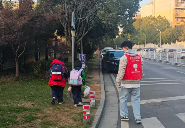 每周五下午,在望城坡街道长华社区麓天东路与华兰路的交叉路口,总有一群身着志愿者服装的大学生在人流与车流中穿梭,为阳明小学和周边幼儿园的孩子和家长提供护学服务。这支由湖南工商大学设计艺术学院青年志愿者协会的大学生组成的“社区爱心护学”志愿服务队,以高度的责任感与饱满的热情开展交通引导与安全护送等服务,用青春力量筑牢放学路上的“安全防线”,成为长华社区一道既温暖又亮丽的风景线。