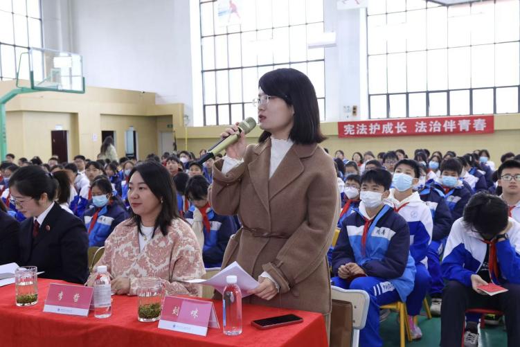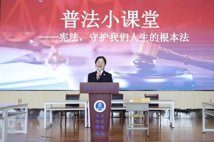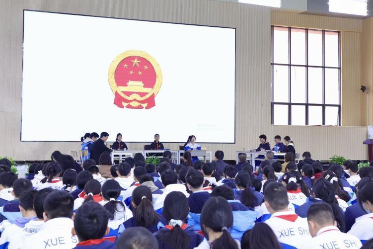 活动在全体学生齐声朗诵宪法法条的庄重氛围中拉开序幕,周南学士实验学校10名学生分组扮演法官、原告、被告等角色,在湖南湘法律师事务所刘咪律师的指导下,围绕未成年人权益保护案例开展模拟庭审,完整呈现法庭调查、法庭辩论、评议宣判等环节。湖南湘法律师事务所刘咪律师对庭审流程细节进行了现场点评,帮助学生们直观理解司法程序与未成年人权益保护要点。