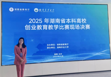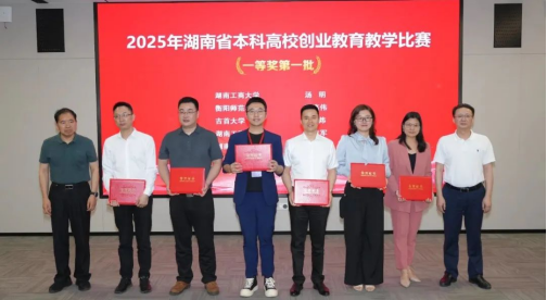 5 月 30 日,首届湖南省普通高校创业教育教学比赛顺利收官。本次赛事吸引全省 41 所高校推荐的 100 个教学团队参赛,经初赛评审,33 个团队脱颖而出晋级决赛。我系汤明老师(右二)领衔的《创新思维与方法》课程教学团队,以决赛总分第一的优异表现,斩获通识课程组一等奖;李应军老师(左二)领衔的《大学生创业基础》课程教学团队,同样荣获通识课程组一等奖。