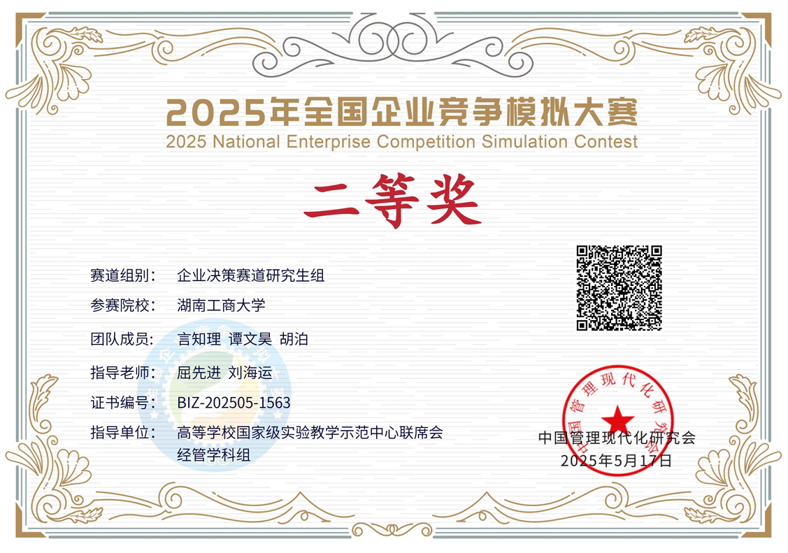 湖南工商大学代表队在此次大赛中表现优异,由工商管理学院(MBA学院)、数智创新创业学院研究生组成的“树下野狐”队(团队成员:言知理、胡泊、谭文昊),在数智创新创业系屈先进和刘海运老师的指导下,历经层层选拔,展现了出色的竞技水平。该团队于4月22日至23日在校内选拔赛中脱颖而出,成功晋级全国复赛。在复赛阶段,团队成员凭借扎实的专业知识、敏锐的市场洞察力、缜密的运营策略以及高效的团队协作能力一路过关斩将,成功晋级全国半决赛。团队优异表现最终为他们赢得了全国二等奖的佳绩。这充分展现了学院在培养具备数智战略思维、企业实战能力和创新创业精神的高层次管理人才方面取得的显著成效。