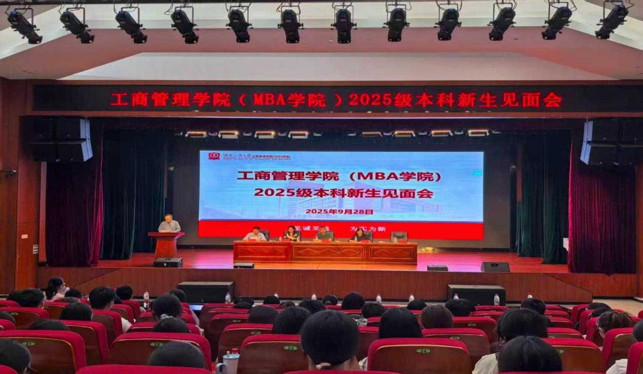 9月28日晚,工商管理学院(MBA学院)2025级本科新生见面会在北校区弘毅报告厅召开。学院领导、教师代表、全体辅导员、辅导员助理及全体新生参加。