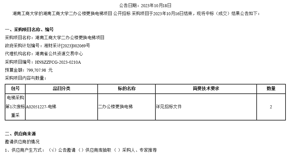 湖南工商大学二办公楼更换电梯项目中标(成交)公告