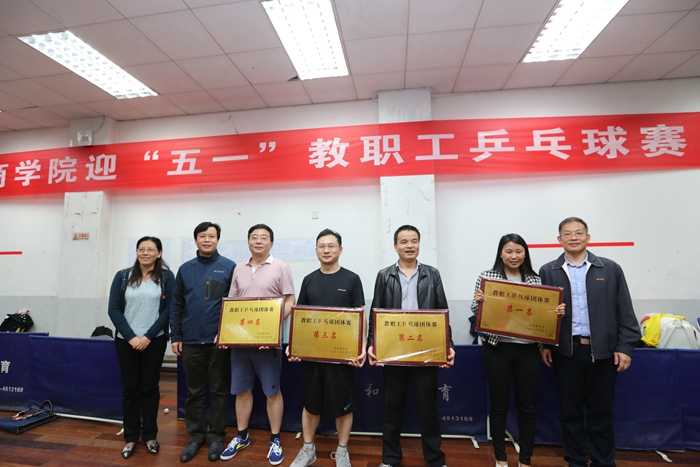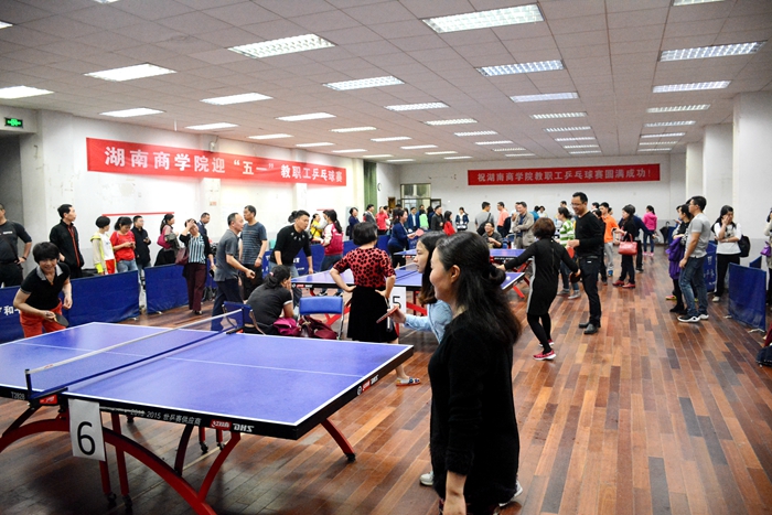 4月25-28日,由校工会主办、体育教研部承办,乒乓球协会协办的湖南商学院“迎五一”教职工乒乓球赛,在南校区体育馆举行。比赛为期一周,副校长刘国权、黎定军参加启动仪式并致辞,宣布比赛开始。来自全校25个分工会代表队,160余名运动员参加了比赛。校党委书记唐亚阳出席颁奖典礼并为获奖代表队、运动员颁奖。