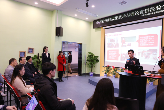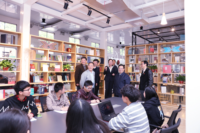 在贤德创客书院,常勃局长一行考察了书院集阅读、学习、创新、创业、创意等多功能于一体的情况,看到同学们正在“大学生党中央治国理政新思想学习社”分享赴各地宣讲经验和展示实践成果,他对学校创新开展思想政治教育工作的途径和方法表示了充分肯定。