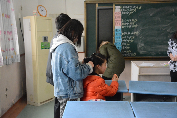 下课铃响了,课间孩子们更活跃起来。志愿者与小朋友打打闹闹,有的孩子一不注意就钻进了志愿者的怀里。干事毕俪文看一个小朋友头发乱糟糟的,细心地为她梳起头发。隔壁班的小朋友好奇地跑了过来,志愿者握着他的手教他一笔一划写下自己的名字。