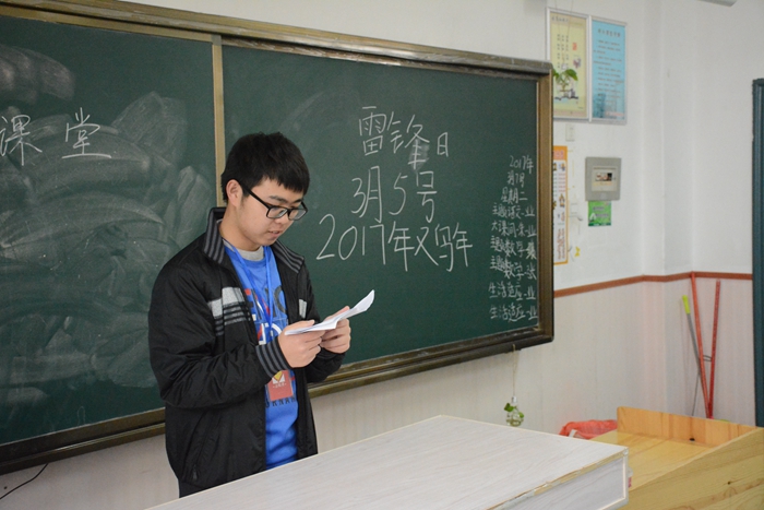 第二节课的内容是朗诵雷锋诗。一张小小的A4纸,印着的不仅是雷锋诗词,更是志愿者们的拳拳期望。不厌其烦地教孩子们读着,他们知道,读完这首诗可能作用并不大。但是只要他们多认识了一个汉字,多知道了一个故事,多体会了一点点雷锋叔叔的精神,都是值得的。