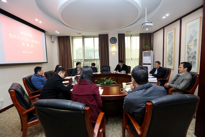 3月16日上午,学校召开党外人大代表、政协委员座谈会。校党委书记唐亚阳、副校长黎定军出席会议,省政协委员欧阳资生、向征,长沙市人大代表陈树、赵小波,长沙市政协委员高政利,岳麓区人大代表李灿,岳麓区政协委员唐湘辉以及统战部等有关人员参加会议。