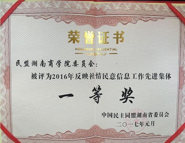 日前,从民盟湖南省委下发的《关于表彰2016年度盟务工作专项考核先进集体、先进个人的决定》(湘盟发[2017]2号)文件获悉,民盟湖南商学院委员会荣获“民盟湖南省委参政议政工作先进集体”、“反映社情民意信息工作先进集体一等奖”;民盟湖南商学院委员会主委、工商管理学院教授刘导波和民盟湖南商学院委员会委员、计算机与信息工程学院副教授刘星宝荣获民盟湖南省委社情民意工作先进个人的荣誉称号。