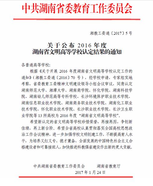 近日,湖南省委教育工委、省教育厅印发《关于公布2016年度湖南省文明高等学校认定结果的通知》(湘教工委通〔2017〕5号),我校被认定为“湖南省文明高等学校”。