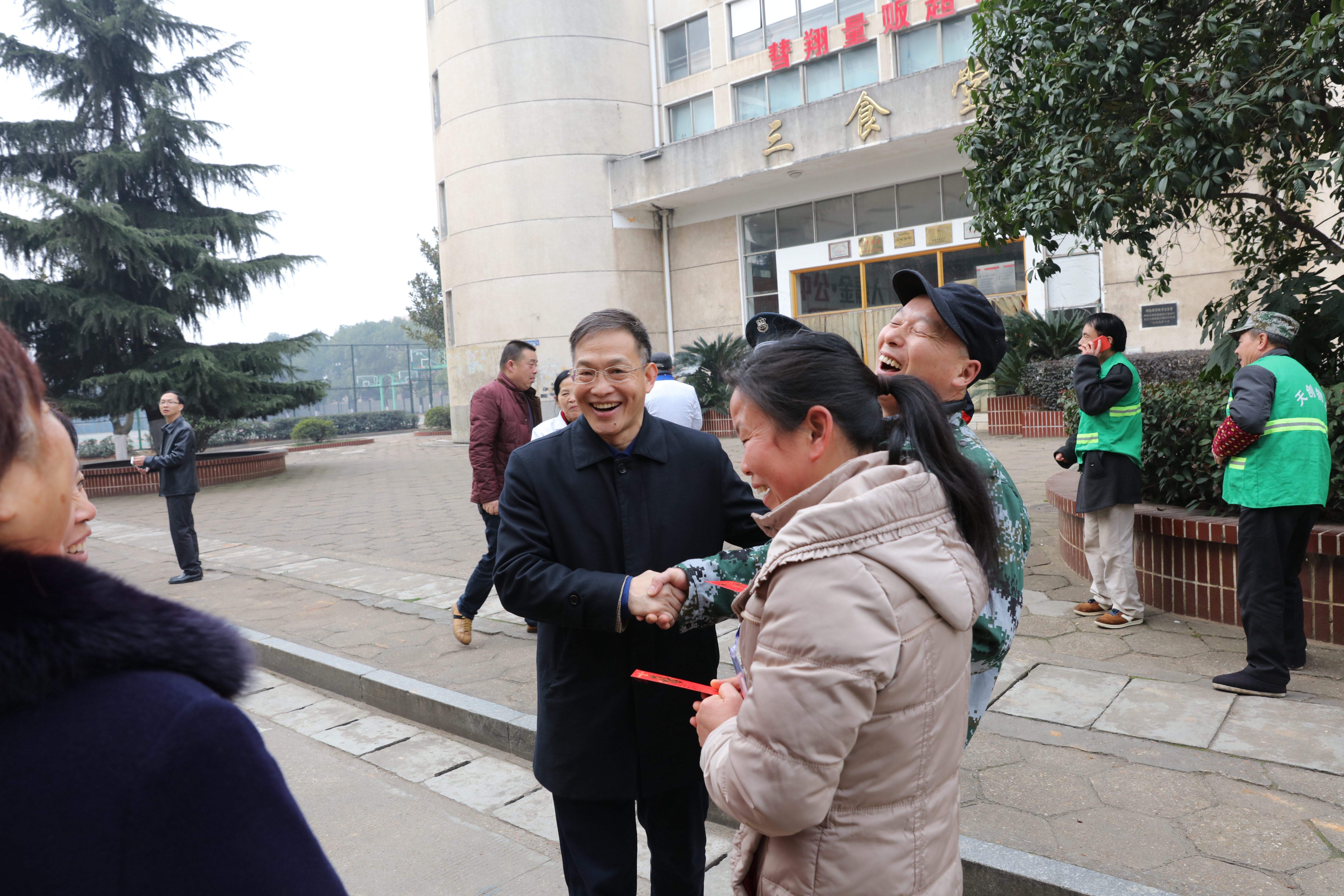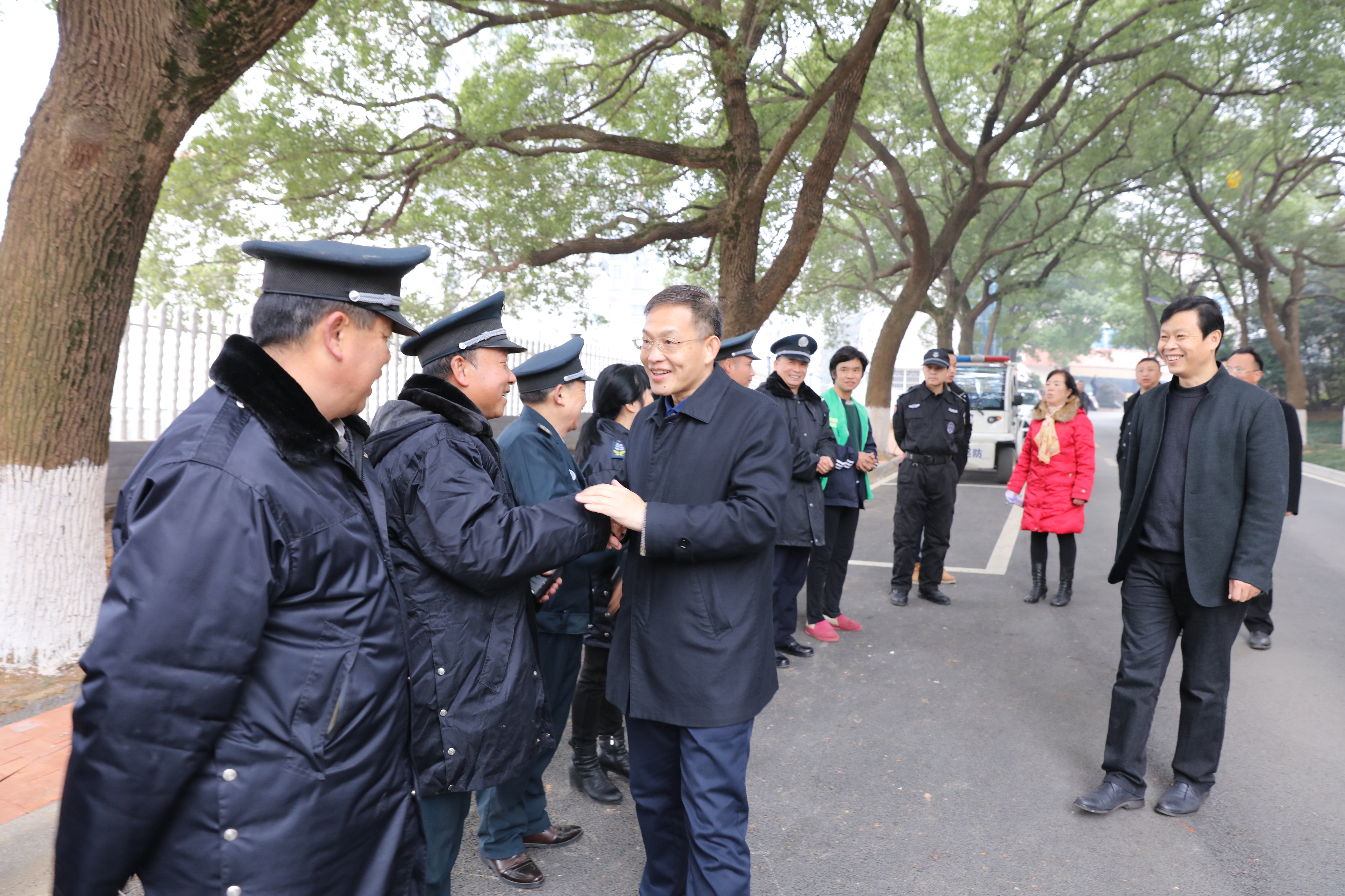 金猴留恋丰收年,彩凤欢啼盛世春。1月28日上午,大年初一的校园洋溢着新春的喜气。校党委书记唐亚阳,副校长刘国权,校党委委员、党政办主任杨良奇率党政办、学生处、教务处、保卫处、后勤处等部门负责人,亲切慰问了春节坚守一线的工作人员。