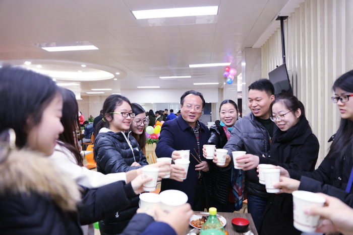 唐亚阳书记向大家致以新年的祝福,他说:“由于各种原因,许多同学无法回家过年。学校特地准备了团圆饭,我们陪同学们一起快快乐乐过年。”唐书记指出,学校是个温暖的大家庭,始终将育人以学生为本放在心上,落实在行动上。学校思想政治工作成绩突出,陶汝琴同学获得“全国十大教育人物”称号,肖霞同学的优秀事迹也成为了大学生学习的榜样。2017年,学校要继续推进“十三五规划”的实施,我们的“十三五”是没有退路的“十三五”,更是不能输也输不起的“十三五”,我们必须咬定目标,认清差距,做到人人担责,像习总书记说的那样“撸起袖子加油干”。