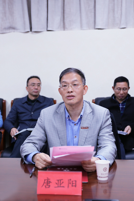 我校党委书记唐亚阳对各位专家来校表示热烈欢迎和衷心感谢。他简要介绍了我校的历史沿革、学校概况、学科布局、办学目标等基本情况,并从对创建省文明高校的认识、创建省文明高校的特色做法与成效及文明高校创建的下一步思考和打算三个方面作题为“建文化大学 铸精神高地”的工作汇报。