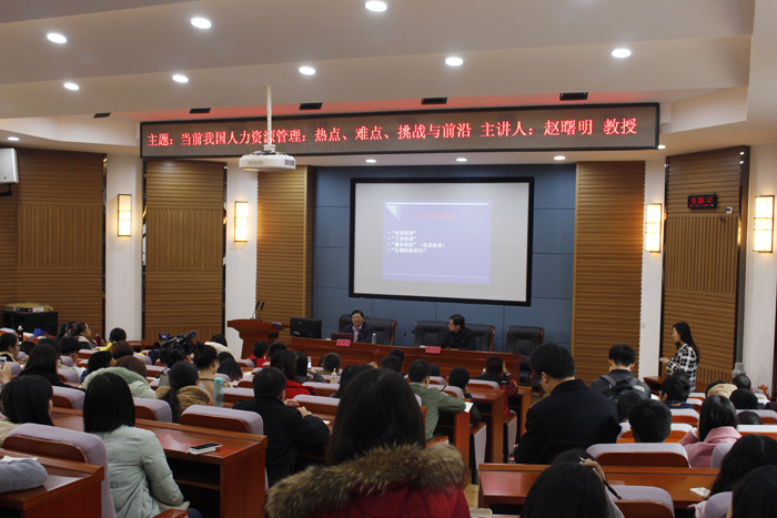 11月27日下午,南京大学商学院名誉院长、企业管理国家重点学科学术带头人、国内著名的人力资源管理方面的专家赵曙明教授应邀来校,在乐知楼F201报告厅以“当前我国人力资源管理:热点、难点、挑战与前沿”为主题举行讲座。副校长曾伏秋主持讲座并为赵曙明教授颁发湖南商学院特聘教授证书。