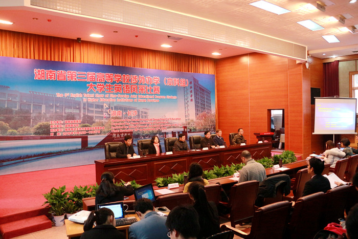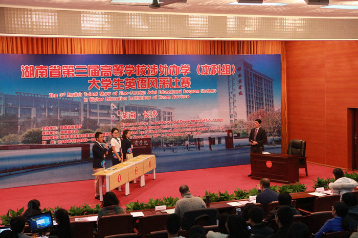 11月26日至27日,第三届高等学校涉外办学组(本科组)大学生英语风采在我校举行。省教育厅党组成员、省委教育工委委员王玉清,我校校领导唐亚阳、曾伏秋、刘国权,省教育厅国际交流处处长王红冰出席比赛开幕式和颁奖仪式。
