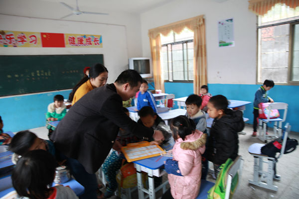8:00,工作队来到兴东村小学一年级教室,给正在早读的孩子们送上在长沙购买的汉语拼音智能学习板。图为周军军向孩子们介绍智能板的使用方法。