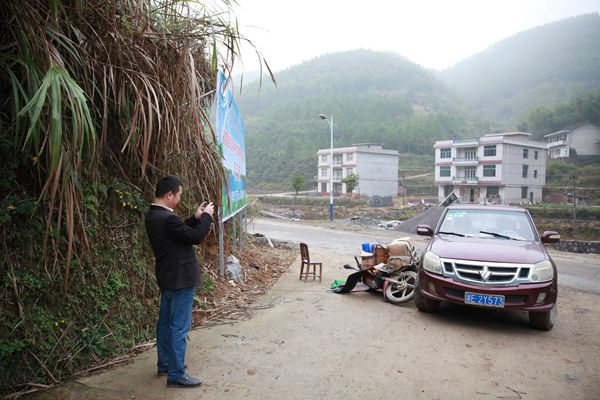 14:35,在林道工地回程路口,村民石威山的皮卡车与一辆邻村的摩托车发生了碰撞,当事人因治疗已撤离现场,地上有血迹。图为周军军用手机记录事故现场。“处理邻里矛盾、意外事件、田地纠纷等,要花掉我们很多时间。”