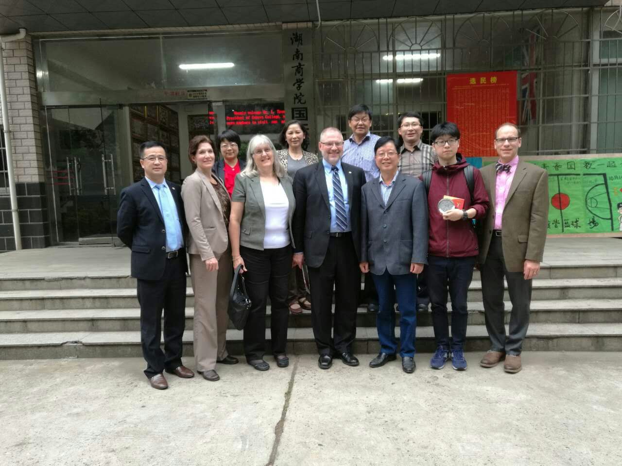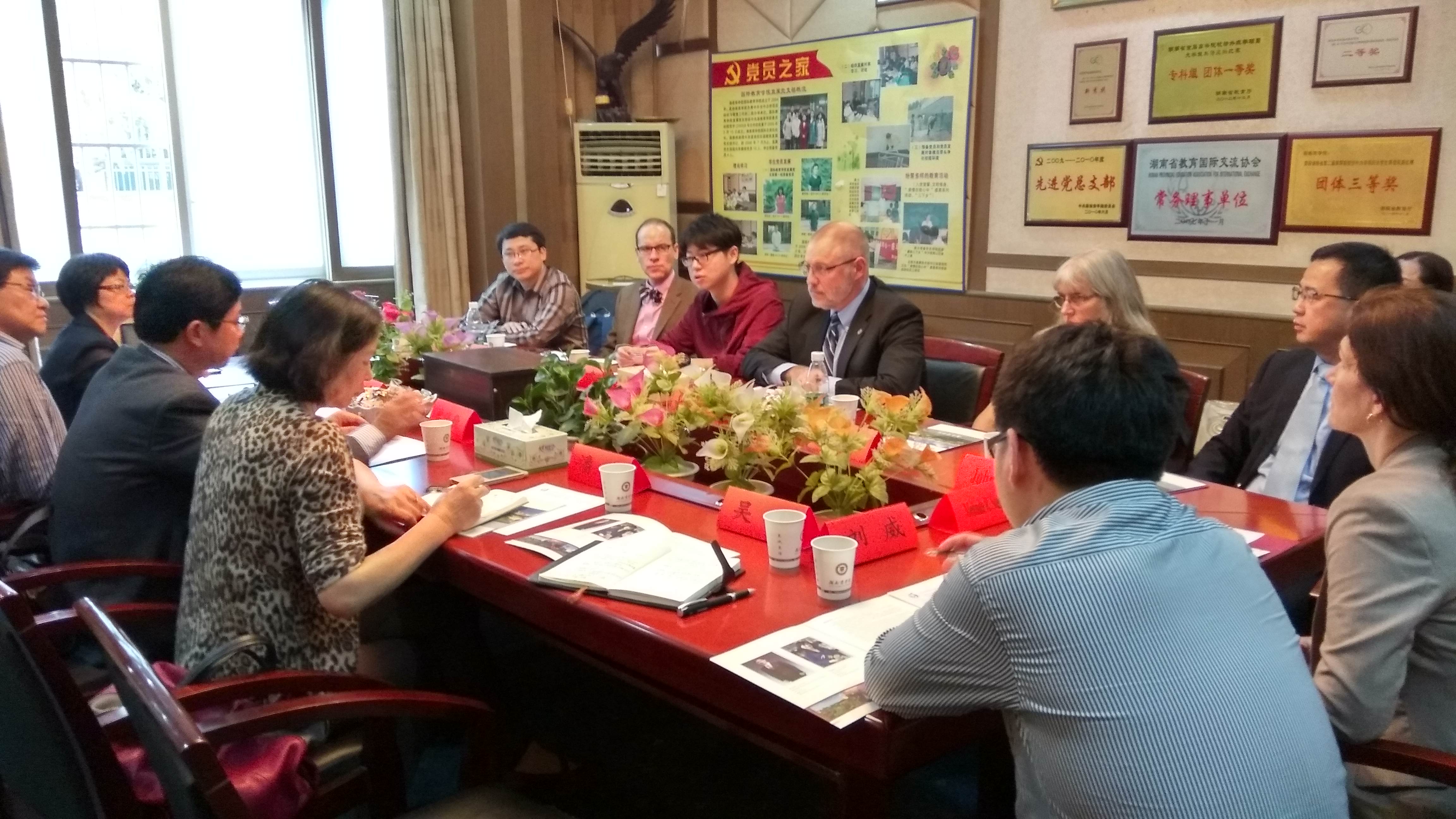 10月18日,美国Geneva College校长Dr. Calvin L. Trump一行八人来我校进行友好访问。曾伏秋副校长亲切会见了来访嘉宾。双方代表在国际教育学院会议室共同探讨了未来可能的合作领域。国际教育学院院长张漾滨、国际交流与合作处处长潘建、国际教育学院副院长徐姝等出席会谈。曾副校长致欢迎辞,并向Trump校长一行介绍了我校的发展历史和规模,表达了合作意愿。双方就师生交流、2+2、4+0等学生项目方面进行了初步探讨。双方都希望增进交流,非常期待未来合作。(文/图 吴漾)