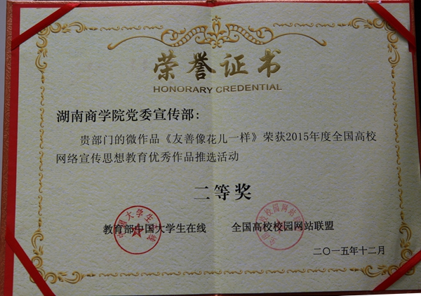 近日,从省教育厅传来消息,由我校党委宣传部制作推送的微作品《友善像花儿一样》,在2015年度全国高校网络宣传思想教育优秀作品推选活动中获得二等奖,实现了我校在网络宣传思想工作方面国家级奖项的突破。
