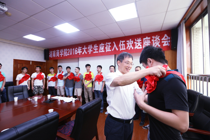 9月13日下午,二办401会议室里传出阵阵掌声,我校2016年大学生应征入伍欢送座谈会在此举行。校党委书记唐亚阳为到场的17名应征入伍学生佩戴红花,副校长曾伏秋出席会议。会议由我校武装部部长、学工处处长张贵华主持。