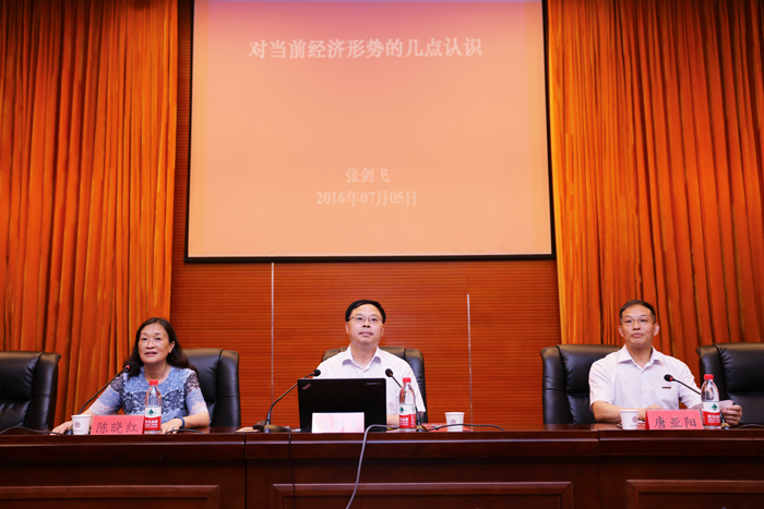 7月5日下午,湖南省人民政府副省长张剑飞莅临我校,作客麓山大讲堂,以 “对当前经济形势的若干认识”为题,结合学习习近平总书记关于经济发展的系列论述的体会,深入分析当前经济形势,探讨供给侧结构性改革、产能过剩、房地产、消费等热点话题,为师生作了一场内涵丰富的经济形势分析讲座。校长陈晓红主持讲座,简要介绍了张剑飞副省长的经历。