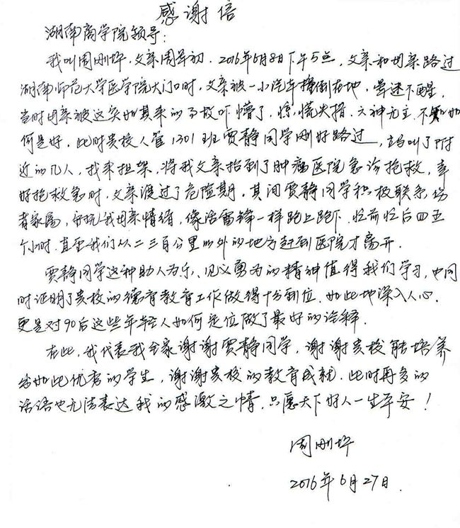 “贾铮同学的这种助人为乐的精神值得我们学习,也同时证明了贵校的德育教育工作做得十分到位,如此深入人心,更是对90后这些年轻人如何定位做了最好的诠释。我代表我全家谢谢贾铮同学,谢谢贵校能培养出如此优秀的学生。此时再多的话语也无法表达我的感激之情,只愿天下好人一生平安!”信中,周刚坪详细讲述了我校人力资源管理1301班贾铮同学救助他父亲的经过。