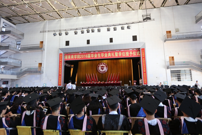 “事业从容 为实为新 践真理共续商院情,人生精彩 至诚至信 求真善常系中国梦”。6月23日上午,学校在体育馆隆重举行2016届毕业生毕业典礼暨学位授予仪式,共同庆祝3467名学生圆满完成学业,踏上新的人生征程。校领导唐亚阳、陈晓红、夏继春、彭进清、陈丽影、王明高、曾伏秋、黎定军、刘国权、杨虹、聂国卿及一级荣誉教授柳思维出席典礼。全体校学位评定委员会委员,各二级单位党政负责人,各二级学院党总支副书记、学办主任、毕业班辅导员、班主任以及校友、学生家长代表,与毕业生共同见证了这一庄严而又喜悦的时刻。典礼由副校长曾伏秋主持。