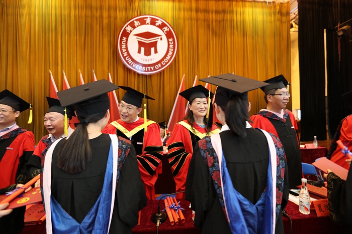 “此地一别离,同学万里征,作为校长我很舍不得你们,很爱你们,我认为你们是湖南商学院最棒的毕业生!”“菁菁校园留下你们青春的足迹,我想过一、二年以后你们会看到漂亮的老虎岭公园,全部铺设沥青路面的校园道路,萃雅新的宿舍投入使用,萃雅和贤德公寓的改造,别致的贤德书院,新的、更大的创客中心,经管教学及实训综合大楼,智慧校园的全面建成等等,更重要的是未来可期待的财经大学等着你们回来!”陈校长言辞切切,赢得了台下毕业生的阵阵欢呼。