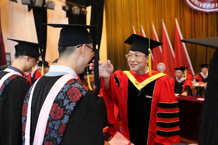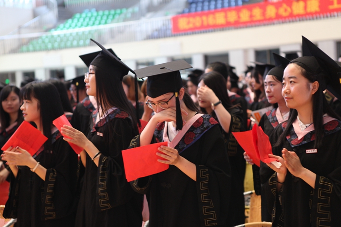 随后,2016届毕业生代表身着学士服,走上主席台,接受出席典礼的校领导为其拨正学士帽流苏,并颁发毕业证、学位证。